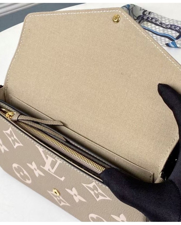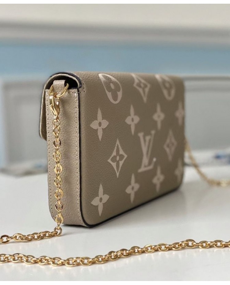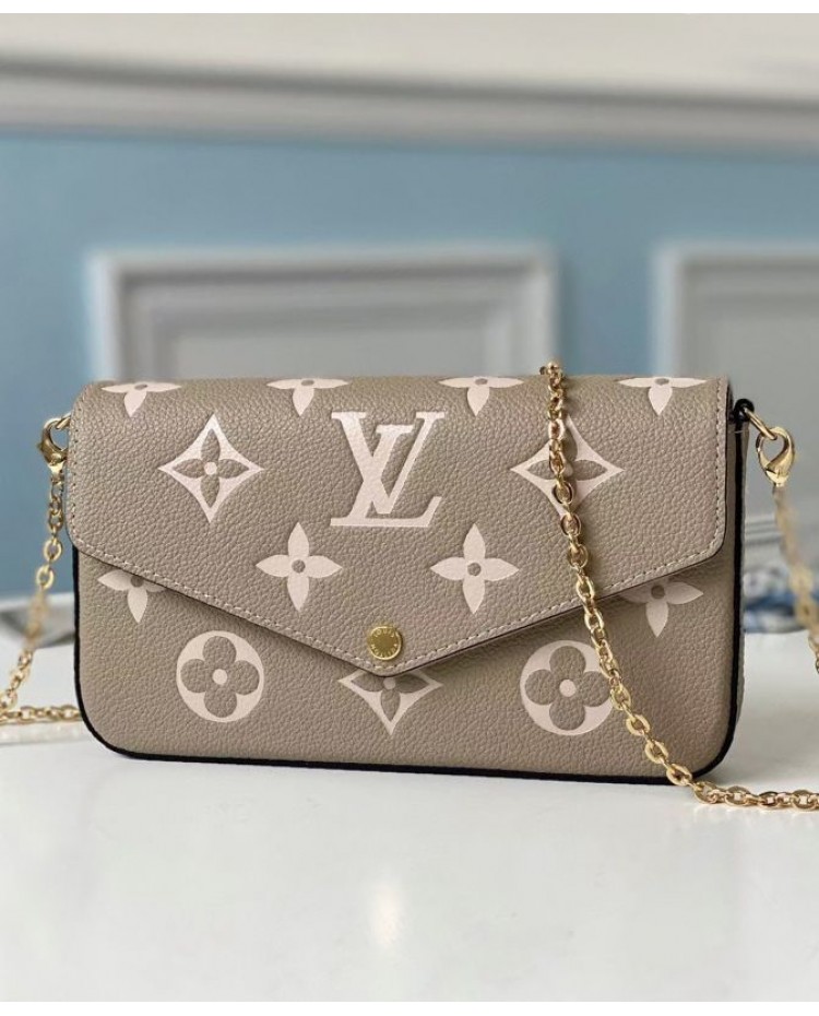Made from Tourterelle Gray Monogram Empreinte leather, the Pochette Felicie is decorated with a Monogram print in a cream color. This stylish envelope-style pouch features two removable inside pockets. It can be carried as a clutch or worn on the shoulder, thanks to its detachable gold-color chain.
