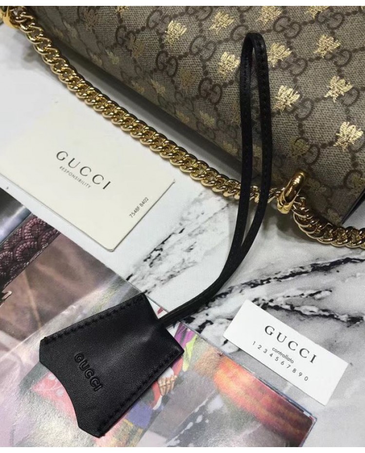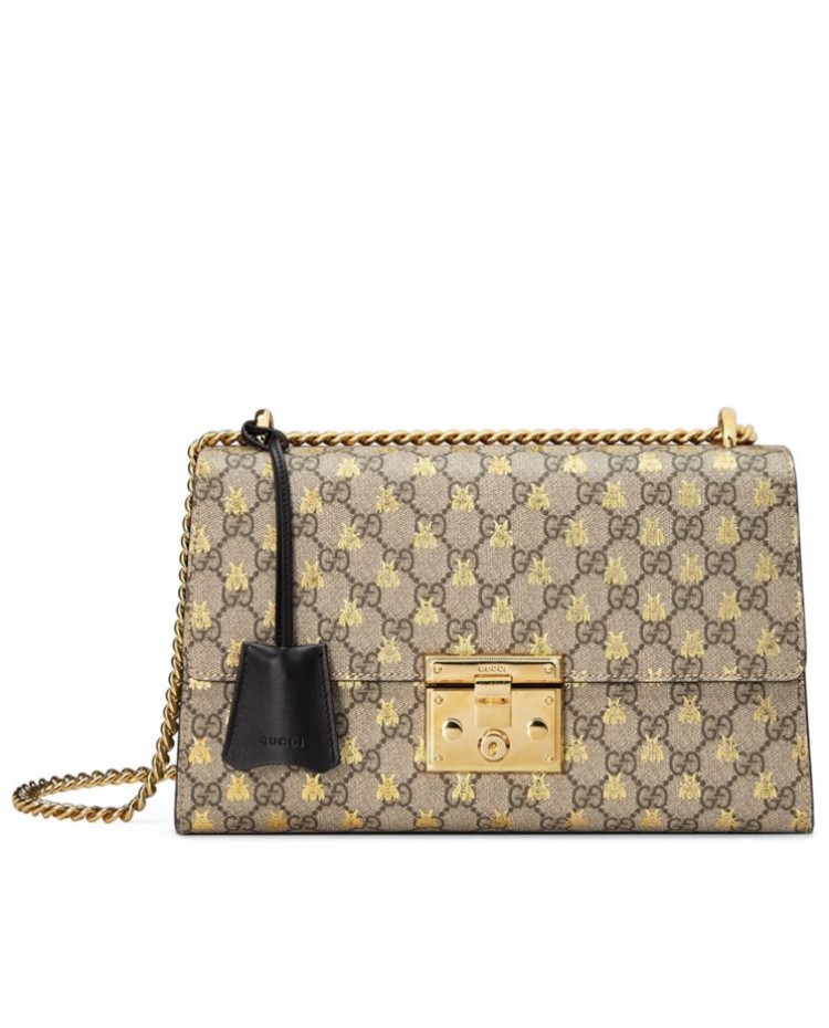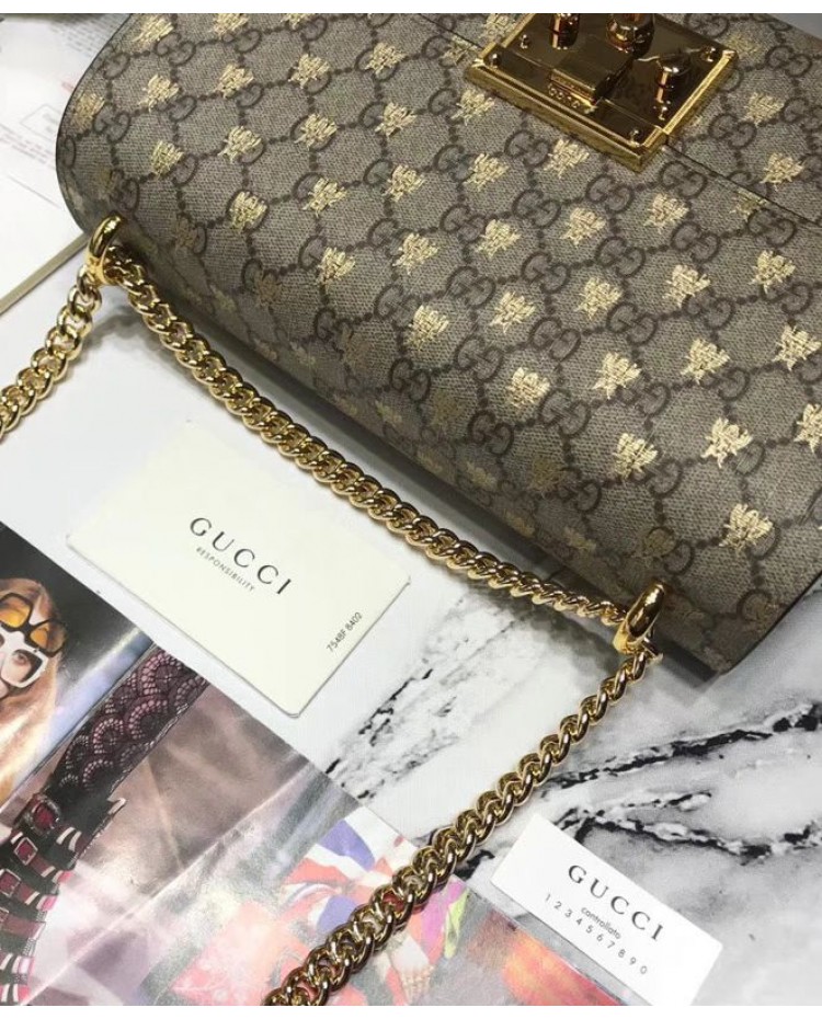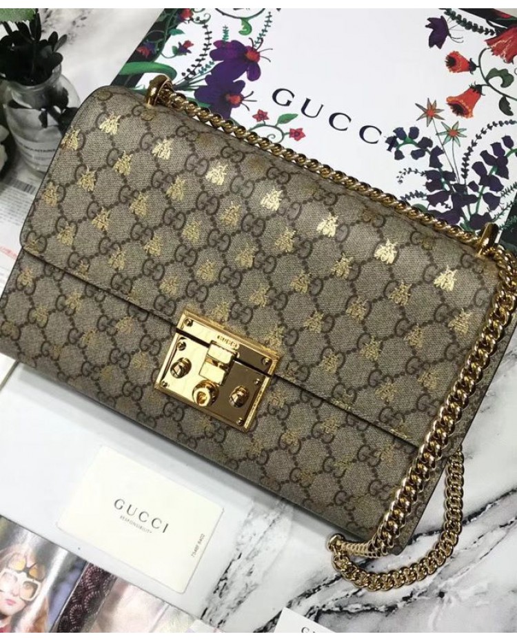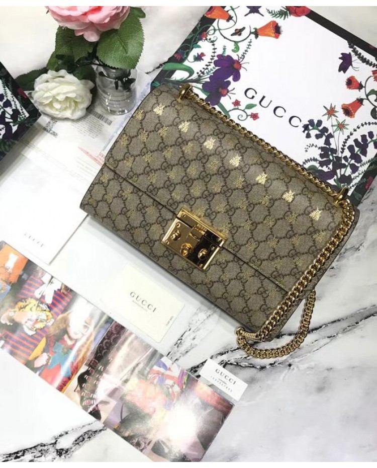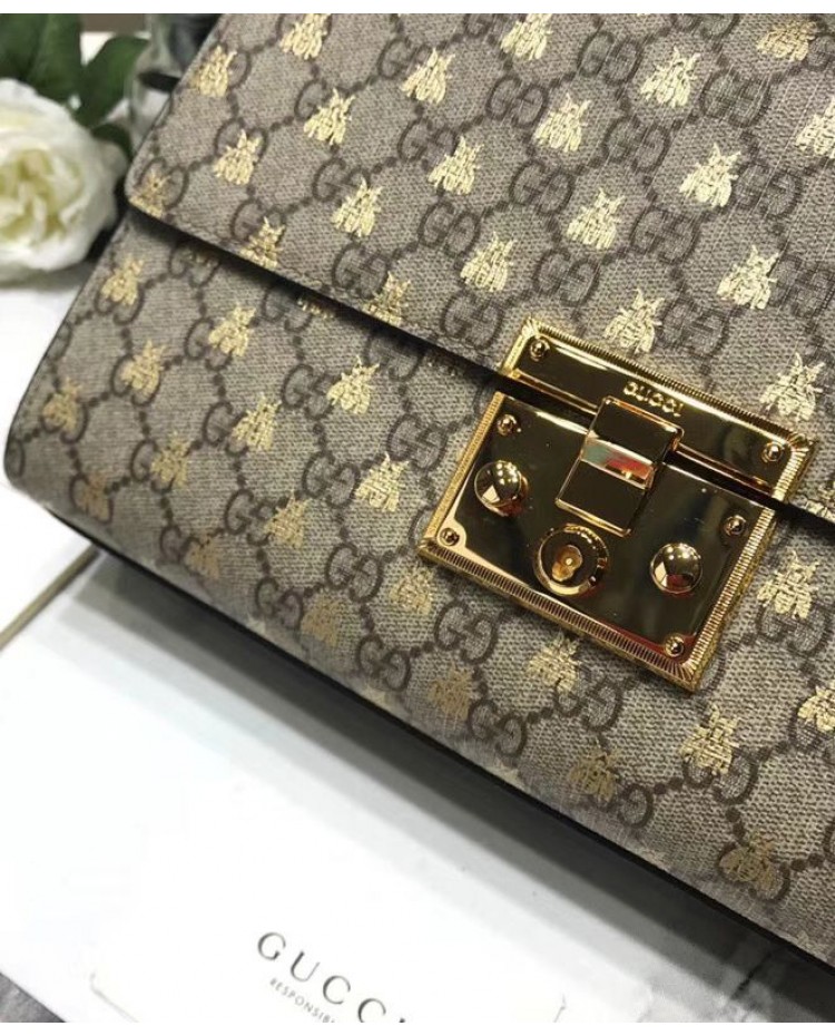 Reviews Over Gucci Medium Padlock GG Supreme Bee Shoulder Bag 409486 Coffee
