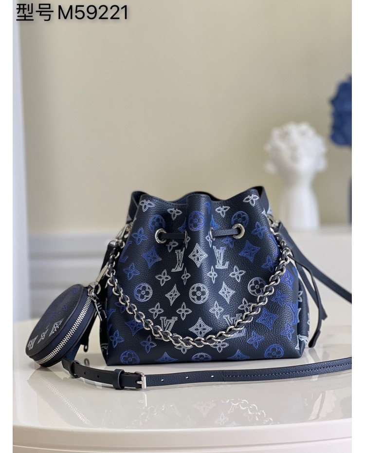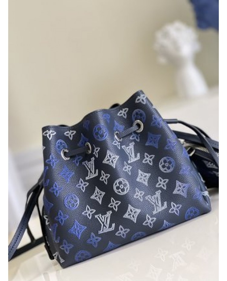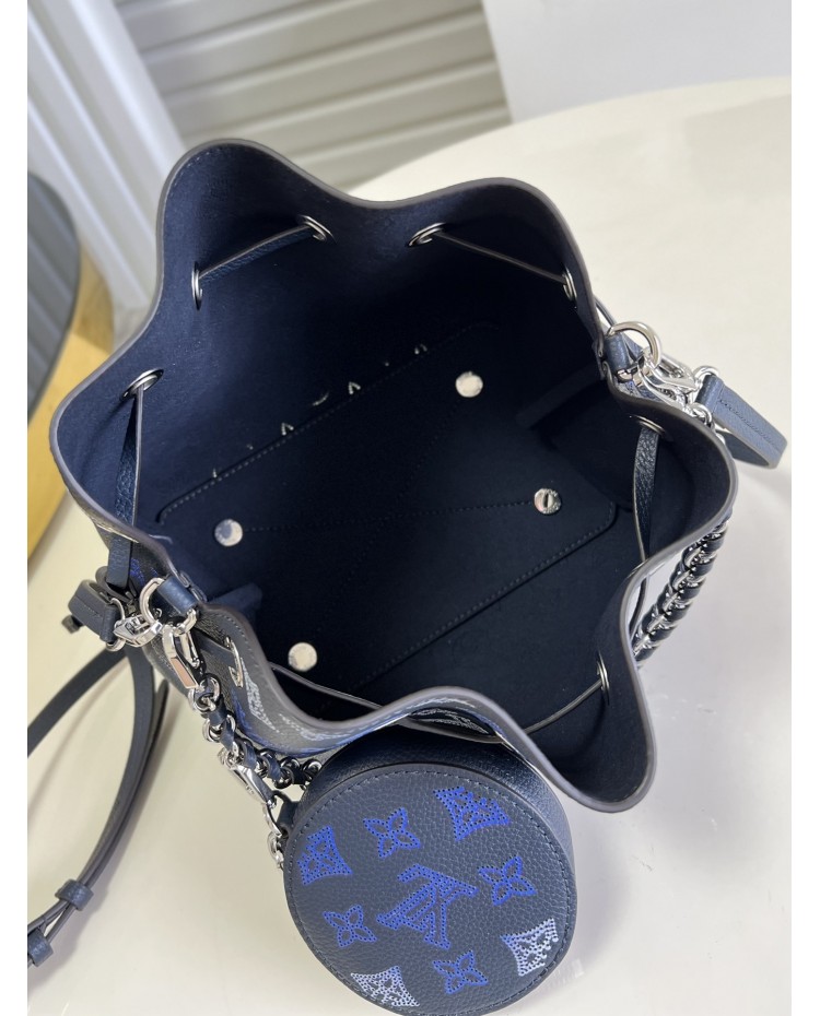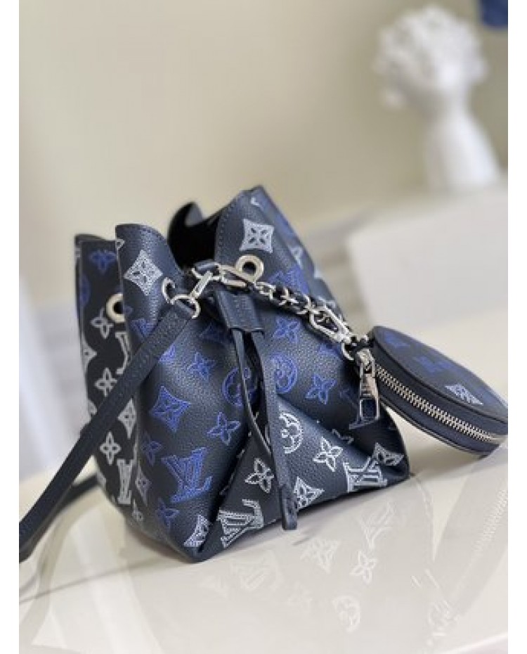 This Bella handbag is perforated calfskin with a Flight Mode print, The drawstring closure and the included coin purse add functional elements,