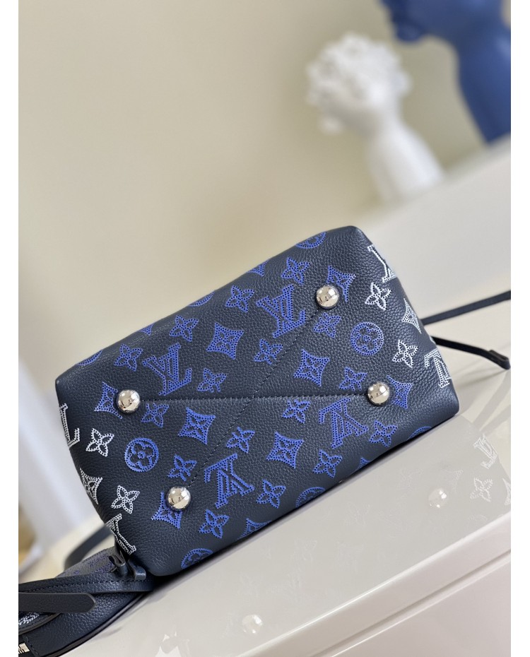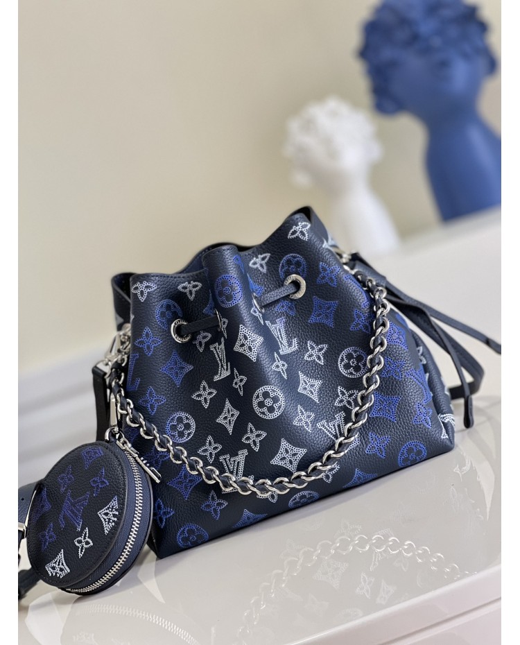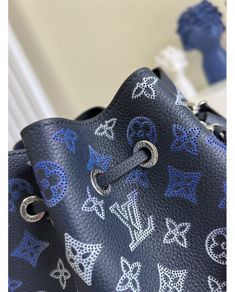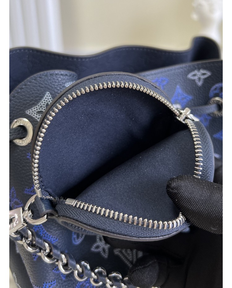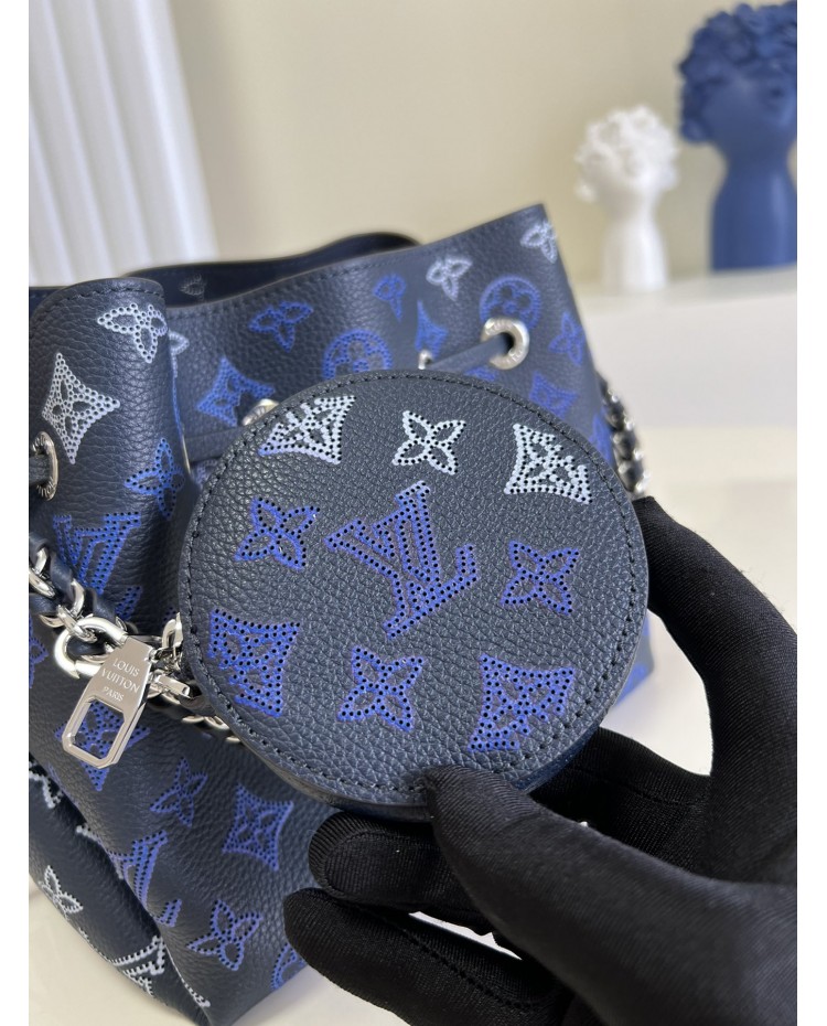 This Bella handbag is perforated calfskin with a Flight Mode print, The drawstring closure and the included coin purse add functional elements,