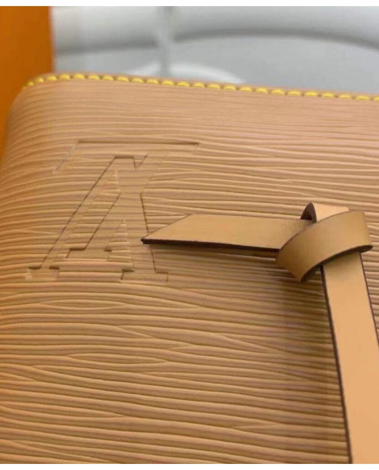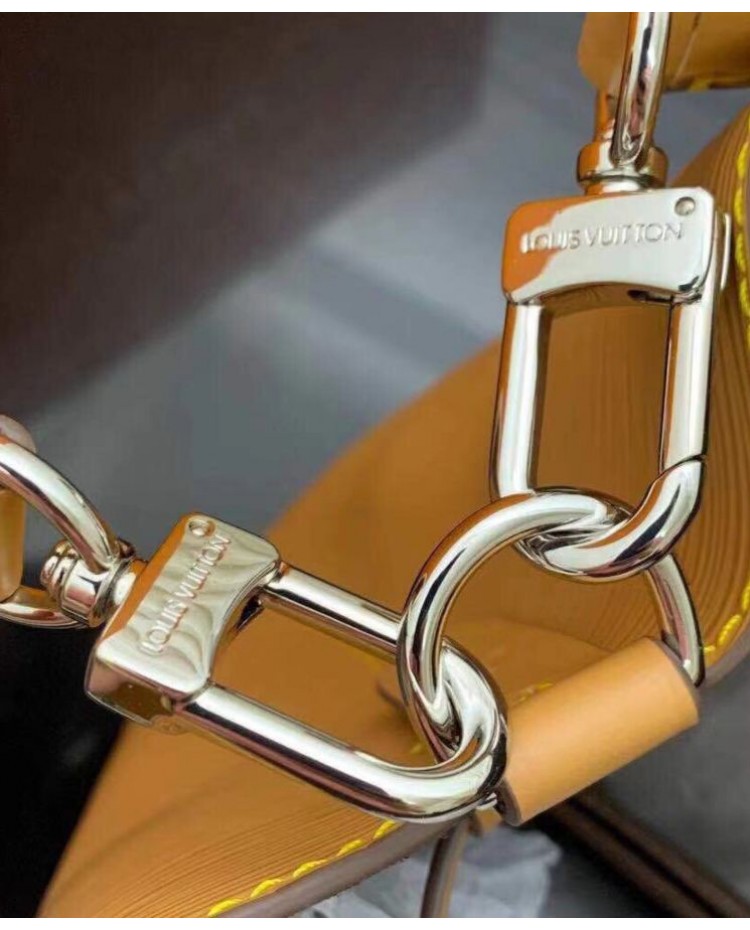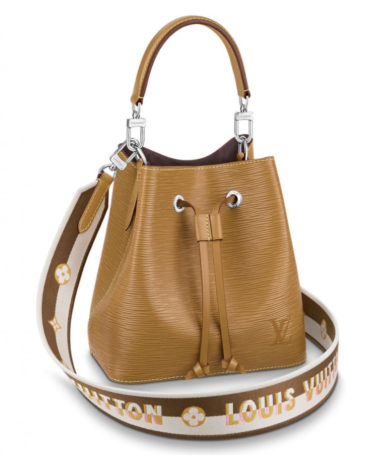 The adorable NeoNoe BB bucket bag now features an embroidered jacquard strap for stylish shoulder carry. The wide removable strap is reversible, featuring Louis Vuitton logos on one side and Monogram Flowers on the other. Made from grained Epi leather, this compact bag has two inside compartments and a central flat pocket that closes with a press stud.