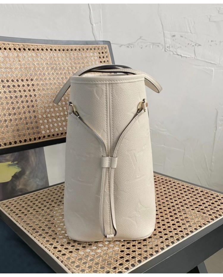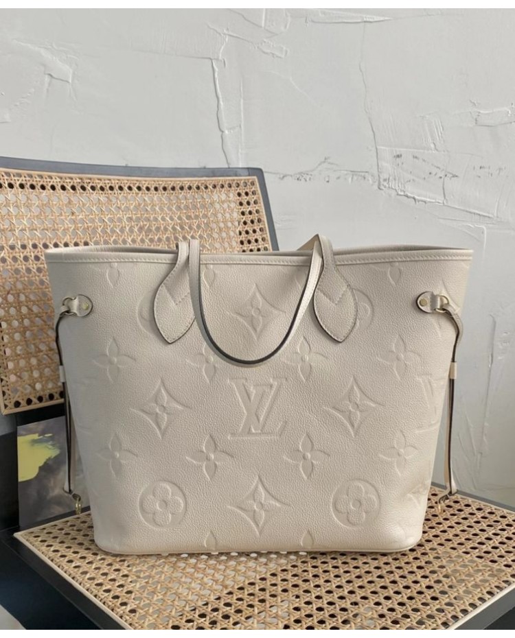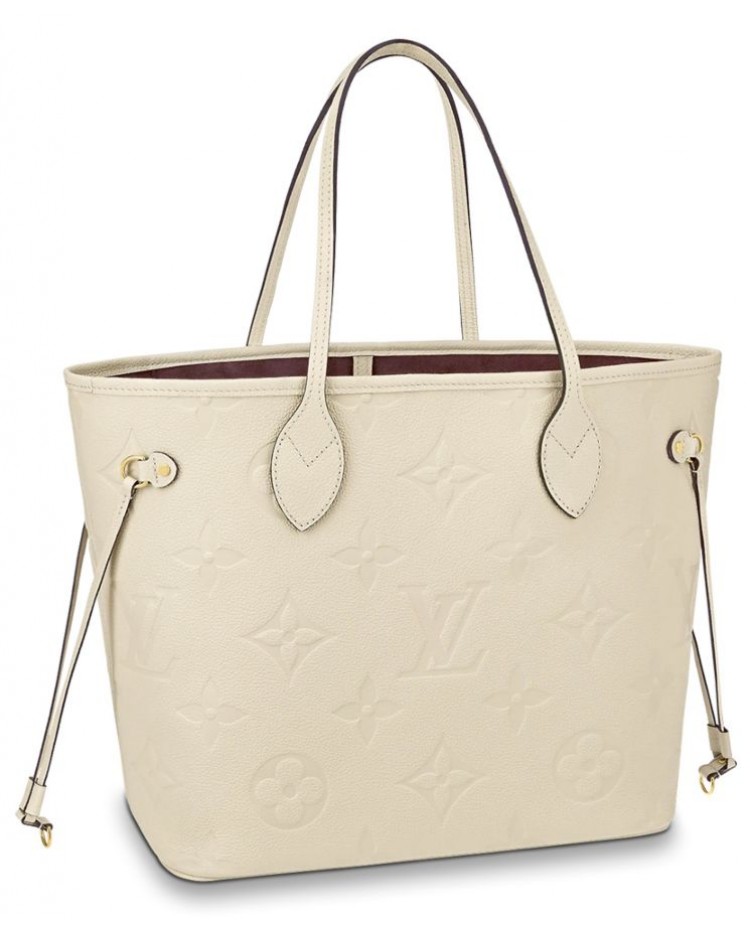 The essential Neverfull MM tote bag now comes in embossed Monogram Empreinte leather. Its generous dimensions make this bag ideal for everyday use, while the long shoulder handles and supple leather mean it is comfortable to carry. With the side laces cinched, this roomy carryall becomes a stylish city bag. It can be worn over the shoulder or on the elbow.