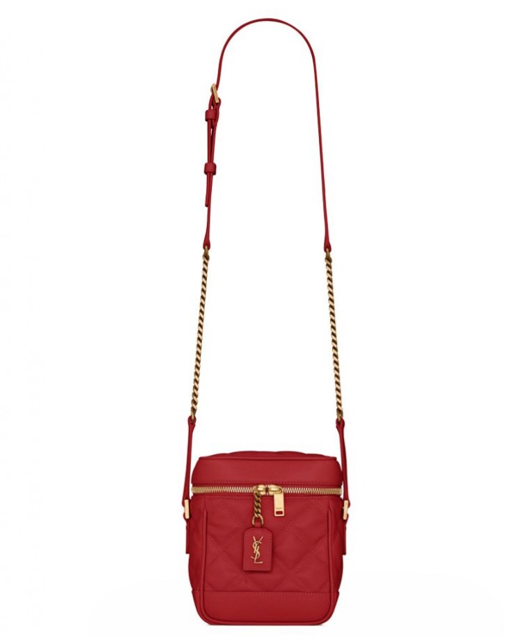 Descriptionmedium satin pouch featuring a nylon webbing handle with crystal embellished logo letters..