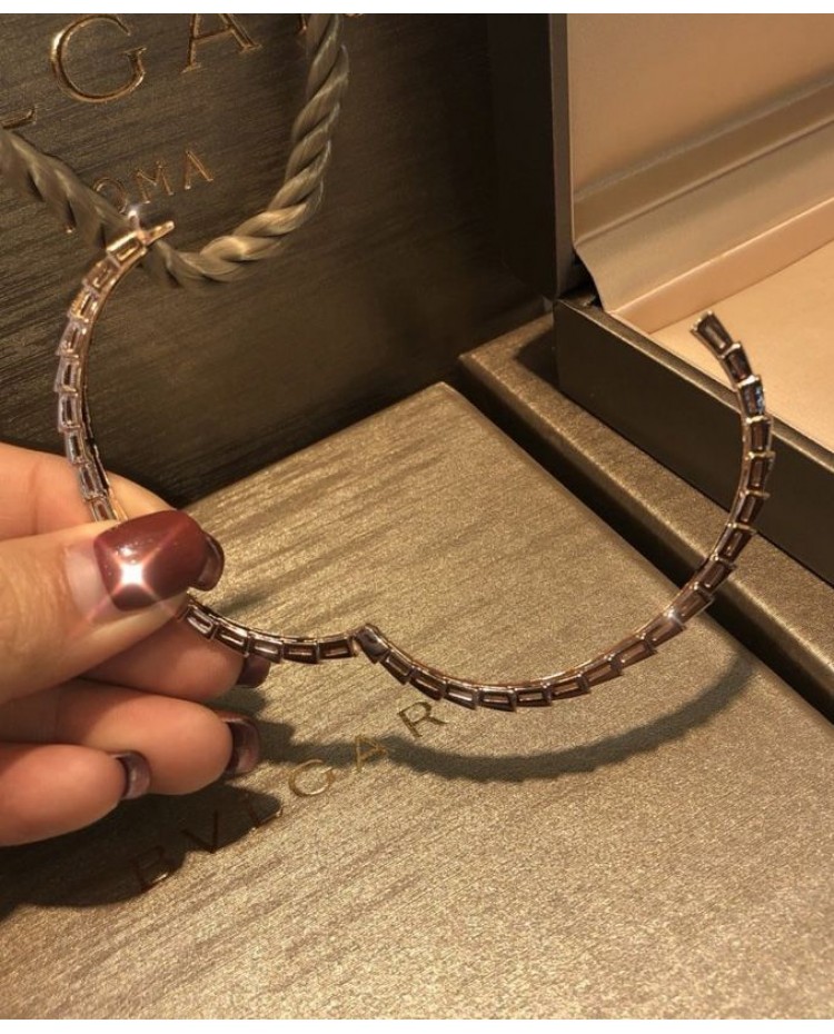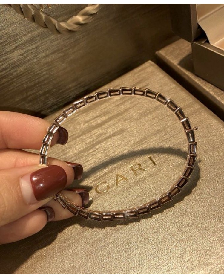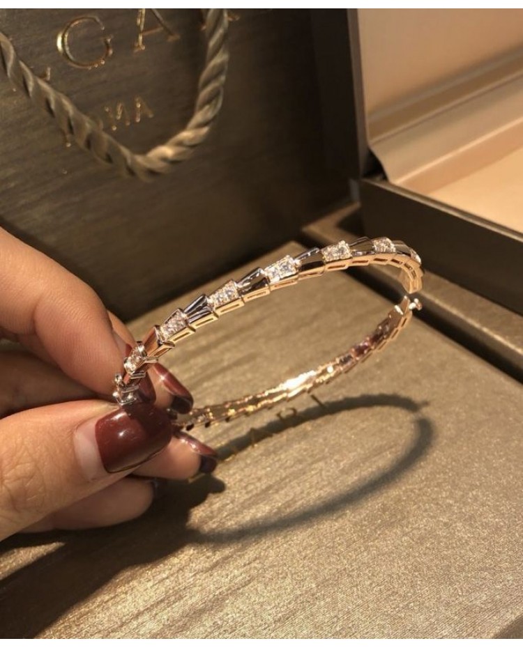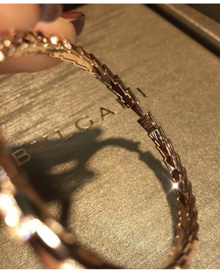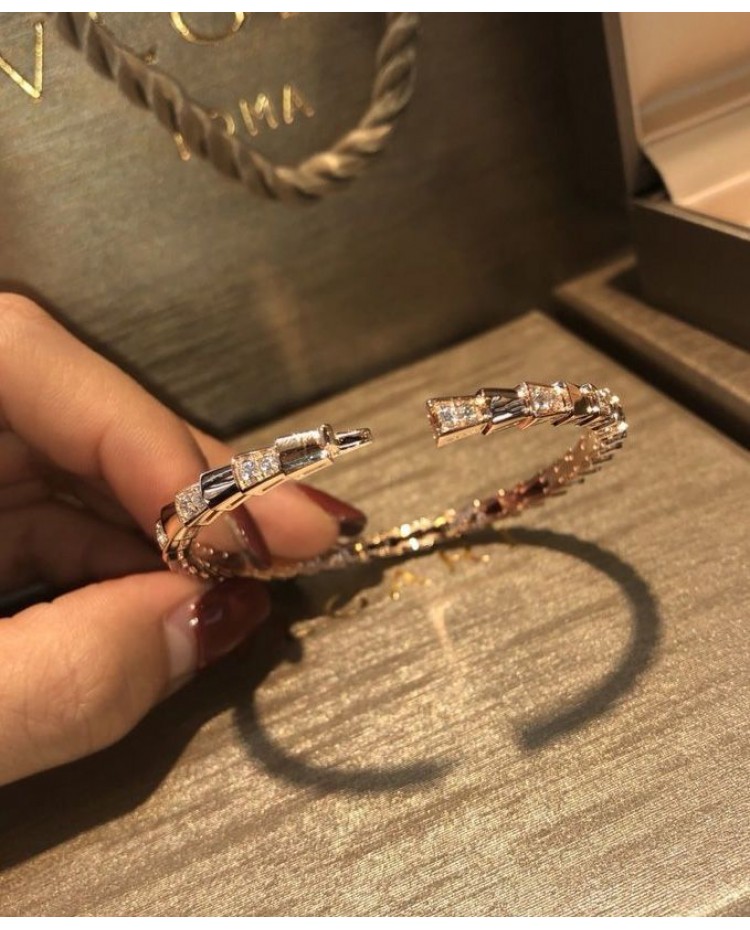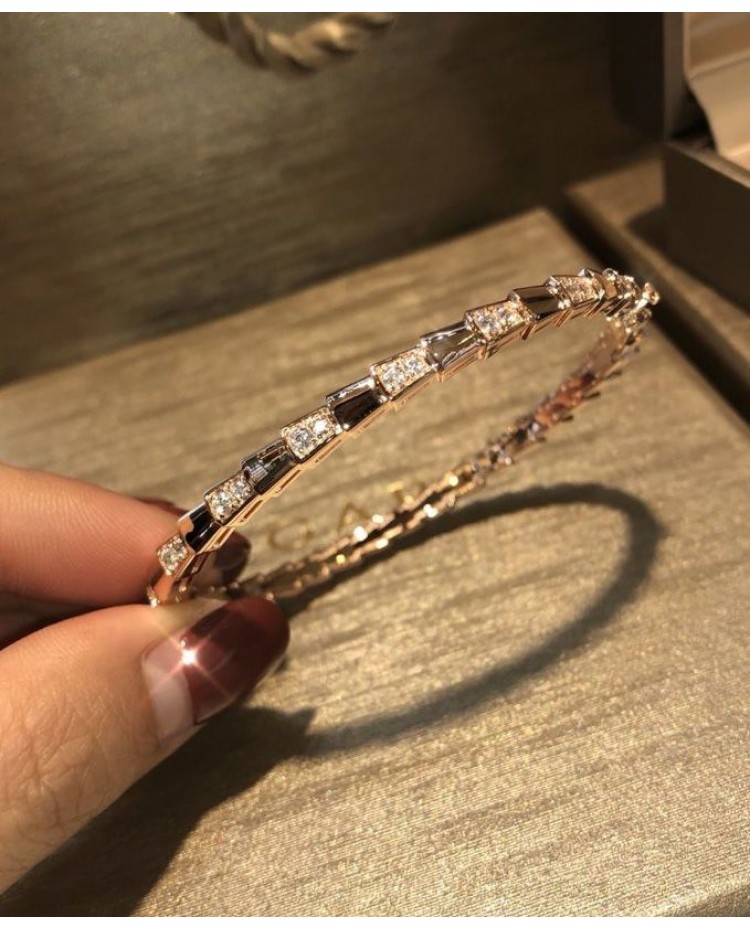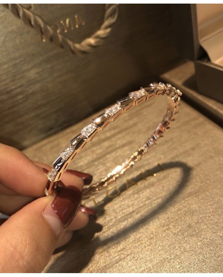 Evocative of the viper's spiral move before its strike, the bracelet coils sensually around the wrist to mesmerize with its enveloping curves. Sophisticated and stylish, the jewel combines the dangerous beauty of the scales with the sinuosity of the snake, camouflaging sensuality and temptation with a hypnotic design. Light and shadow, knowledge and desire, the two facets of the serpent's nature are revealed. Serpenti 18 kt rose gold bracelet set with demi pave diamonds